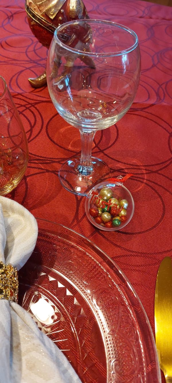Éveillez la magie des fêtes avec notre magnifique marque-place en forme de boule de Noël transparente, garnie de merveilles scintillantes. Chaque boule est une petite œuvre d’art, prête à illuminer votre table de fête et à émerveiller vos invités. Surmontée d’un adorable nœud assorti, cette boule de Noël ne se contente pas de désigner une place ; elle devient un trésor à emporter, un souvenir enchanteur de moments partagés.