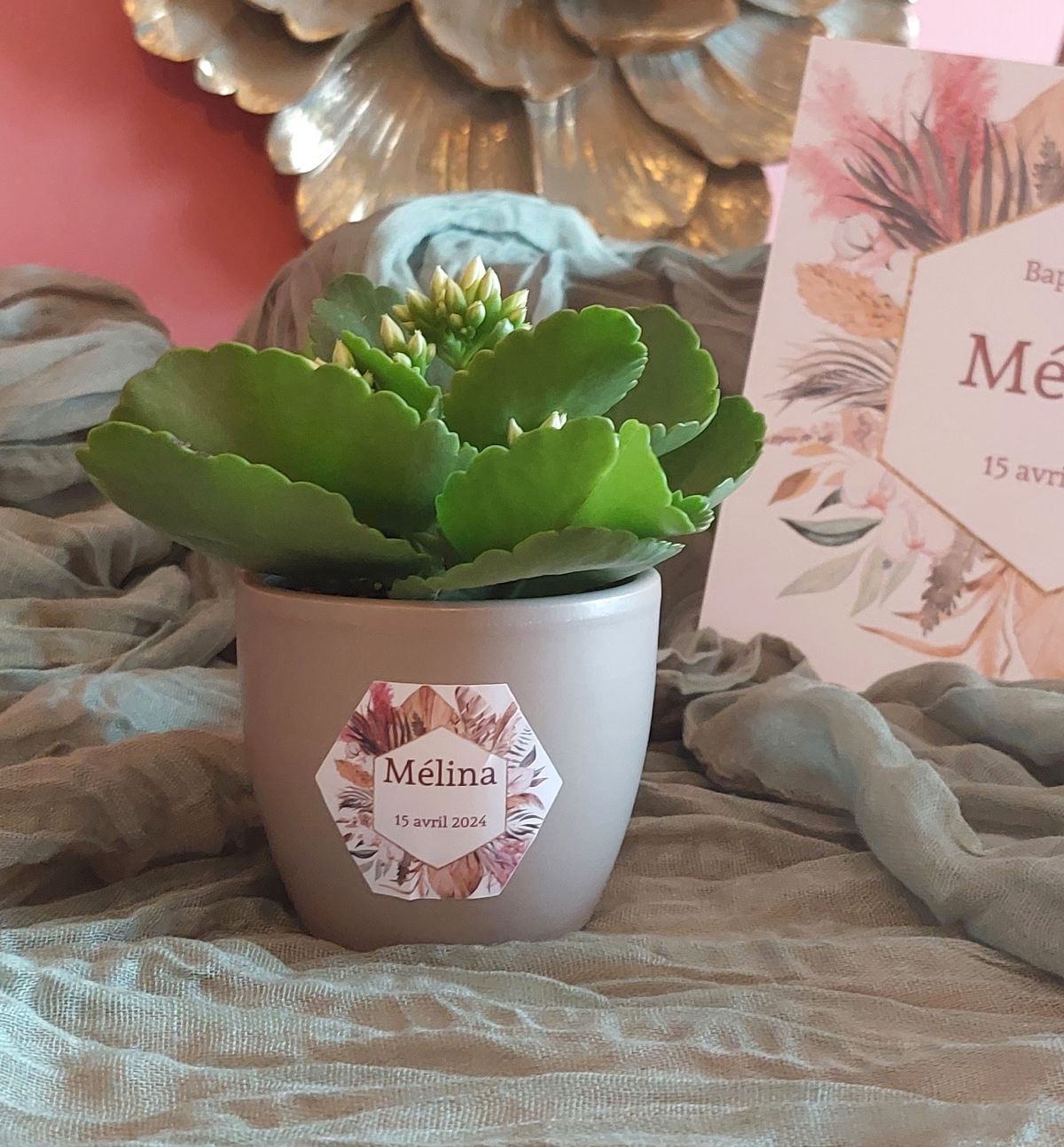 Offrez à vos invités un souvenir inoubliable avec cette petite plante personnalisée. Chaque plante est soigneusement sélectionnée pour sa beauté et sa longévité, symbolisant la croissance et la prospérité. Un sticker personnalisé au nom de votre événement, un message de remerciement ou une date spéciale, créant ainsi un souvenir unique et durable. Ce cadeau écologique est le moyen idéal pour exprimer votre gratitude et laisser un souvenir vivant de votre journée spéciale. Plantez l’amour, partagez la joie !